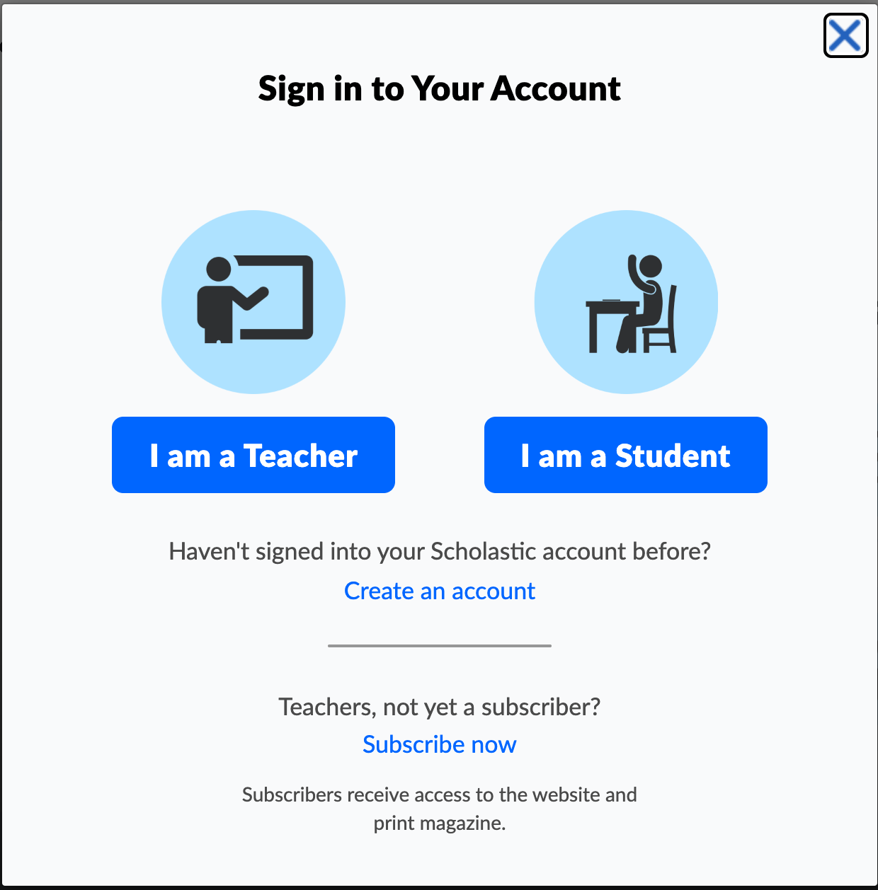 If you’ve connected your Google Classroom or Clever account with Scholastic, you can also click the Google Classroom or Clever buttons to sign in that way. (Click here to learn more about connecting your account with Learning Management Systems.)