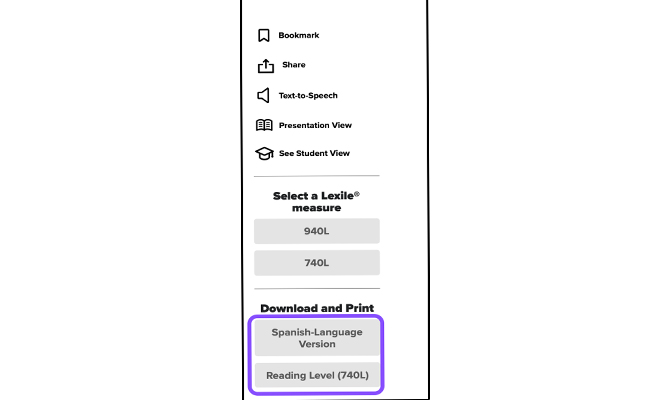 You can download and print any Spanish or lower-level versions of articles that look exactly like the on-level story in the magazine. Just look to the left of the article and click the level you want under the “Download & Print” heading.